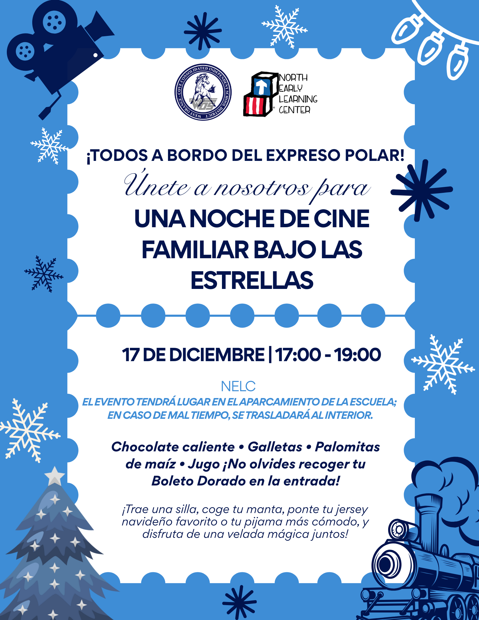 A Family Movie Night Under the Stars has been rescheduled to Wednesday, December 17th, from 5-7 p.m. at North Early Learning Center!